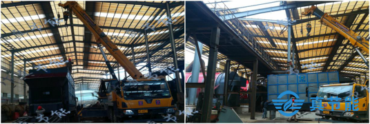 下圖是“旋耙飛騰三較多回路”污泥烘干機(jī)主機(jī)吊裝時(shí)的情景。